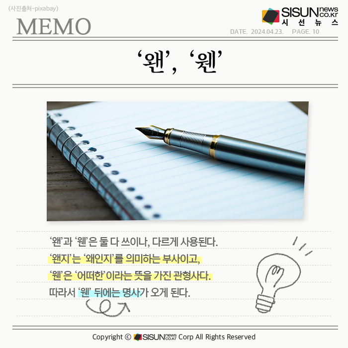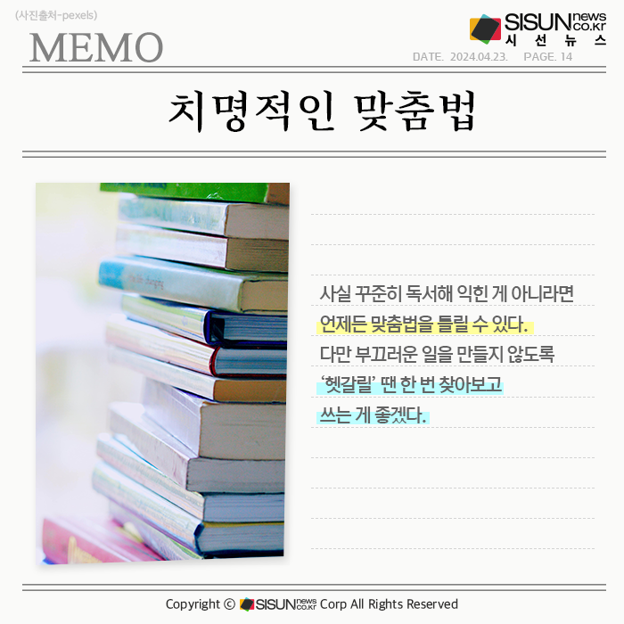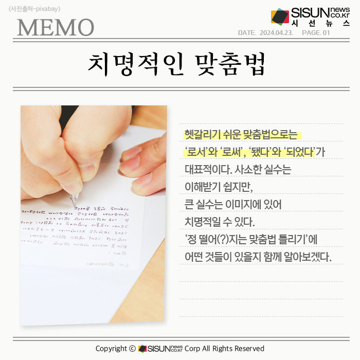 시선뉴스=정혜인 기자 / 디자인=김선희 proㅣ헷갈리기 쉬운 맞춤법으로는 ‘로서’와 ‘로써’, ‘됐다’와 ‘되었다’가 대표적이다. 사소한 실수는 이해받기 쉽지만, 큰 실수는 이미지에 있어 치명적일 수 있다. 애인이 맞춤법을 너무 많이 틀려 이별을 고민하는 사례도 생각보다 많다. ‘정 떨어지는 맞춤법 틀리기’에 어떤 것들이 있을지 함께 알아보겠다.