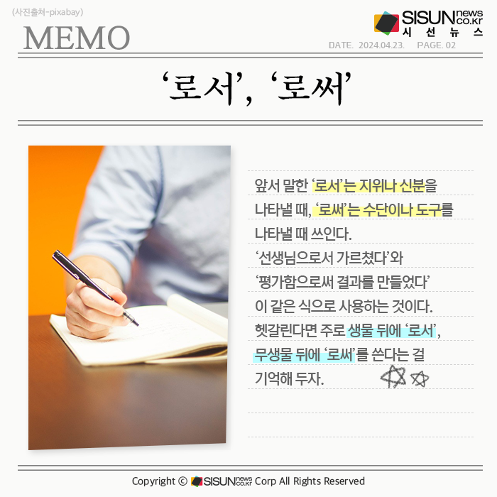앞서 말한 ‘로서’는 지위나 신분을 나타낼 때, ‘로써’는 수단이나 도구를 나타낼 때 쓰인다. ‘선생님으로서 가르쳤다’와 ‘평가함으로써 결과를 만들었다’ 이 같은 식으로 사용하는 것이다. 헷갈린다면 주로 생물 뒤에 ‘로서’, 무생물 뒤에 ‘로써’를 쓴다는 걸 기억해 두자.