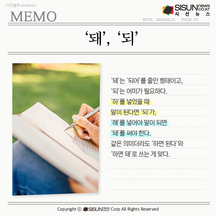 ‘돼’는 ‘되어’를 줄인 형태이고, ‘되’는 어미가 필요하다. ‘하’를 넣었을 때 말이 된다면 ‘되’가, ‘해’를 넣어야 말이 되면 ‘돼’를 써야 한다. 같은 의미더라도 ‘하면 된다’와 ‘하면 돼’로 쓰는 게 맞다. 이와 비슷한 것으로는 ‘봬요’가 있다. ‘봬’는 ‘뵈어요’의 준말이어서 ‘뵈요’는 틀린 표현이다.