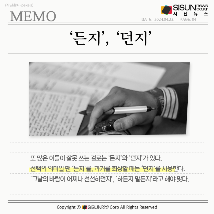 또 많은 이들이 잘못 쓰는 걸로는 ‘든지’와 ‘던지’가 있다. 선택의 의미일 땐 ‘든지’를, 과거를 회상할 때는 ‘던지’를 사용한다. ‘그날의 바람이 어찌나 선선하던지’, ‘하든지 말든지’라고 해야 맞다.