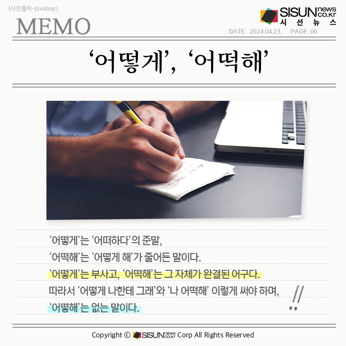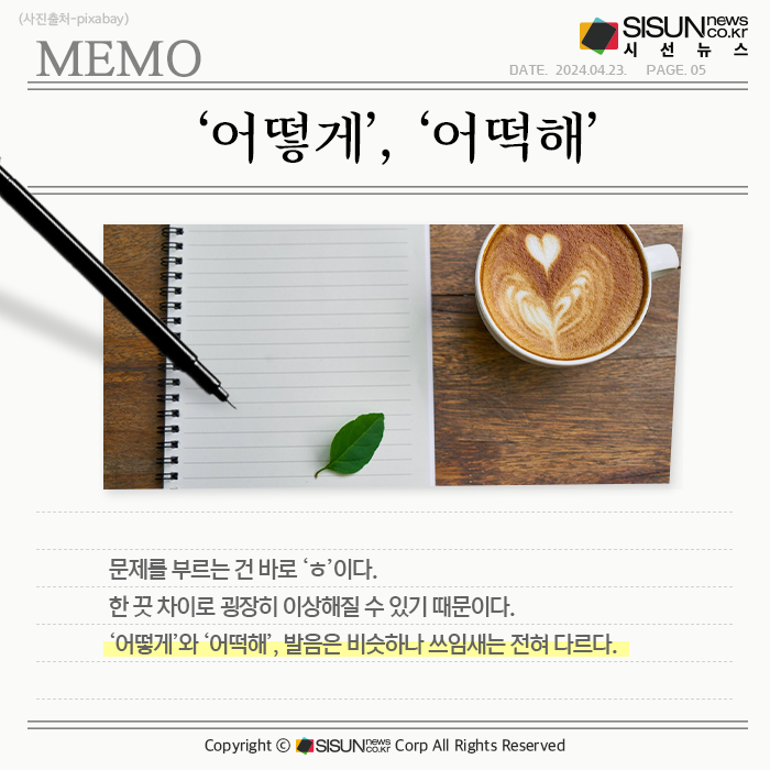 문제를 부르는 건 바로 ‘ㅎ’이다. 한 끗 차이로 굉장히 이상해질 수 있기 때문이다. ‘어떻게’와 ‘어떡해’, 발음은 비슷하나 쓰임새는 전혀 다르다. ‘어떻게’는 ‘어떠하다’의 준말, ‘어떡해’는 ’어떻게 해‘가 줄어든 말이다. ’어떻게‘는 부사고, ’어떡해‘는 그 자체가 완결된 어구다. 따라서 ’어떻게 나한테 그래‘와 ’나 어떡해‘ 이렇게 써야 하며, ’어떻해‘는 없는 말이다.