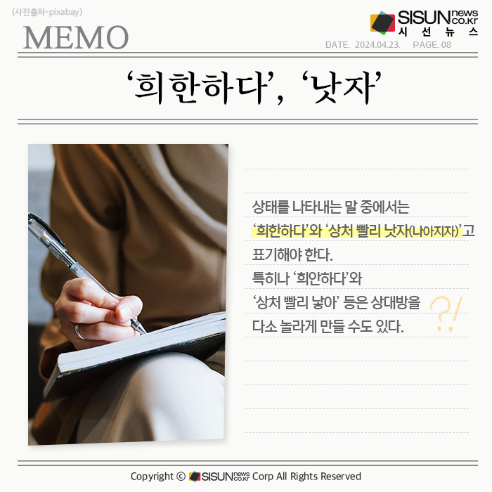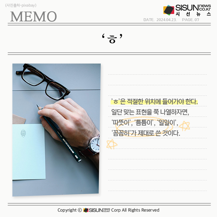 ’ㅎ’은 적절한 위치에 들어가야 한다. 일단 맞는 표현을 쭉 나열하자면, ‘따뜻이’, ‘틈틈이’, ‘일일이’, ‘꼼꼼히’가 제대로 쓴 것이고, 상태를 나타내는 말 중에서는 ‘희한하다’와 ‘상처 빨리 낫자(나아지자)’고 표기해야 한다. 특히나 ‘희안하다’와 ‘상처 빨리 낳아’ 등은 상대방을 다소 놀라게 만들 수도 있다.