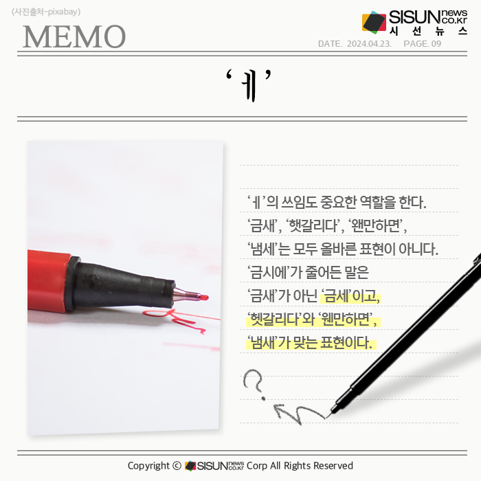 ‘ㅔ’의 쓰임도 중요한 역할을 한다. ‘금새’, 햇갈리다‘, ’왠만하면‘, ’냄세‘는 모두 올바른 표현이 아니다. ’금시에‘가 줄어든 말은 ’금새‘가 아닌 ’금세‘이고, ’헷갈리다‘와 ’웬만하면‘, ’냄새‘가 맞는 표현이다. ’왠‘과 ’웬‘은 둘 다 쓰이나, 다르게 사용된다. ’왠지‘는 ’왜인지‘를 의미하는 부사이고, ’웬‘은 ’어떠한‘이라는 뜻을 가진 관형사다. 따라서 ’웬‘ 뒤에는 명사가 오게 된다.