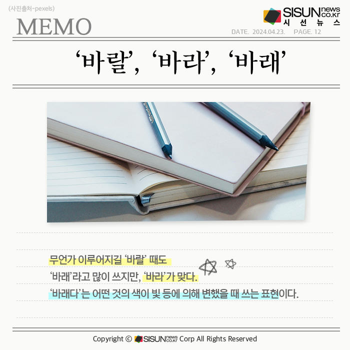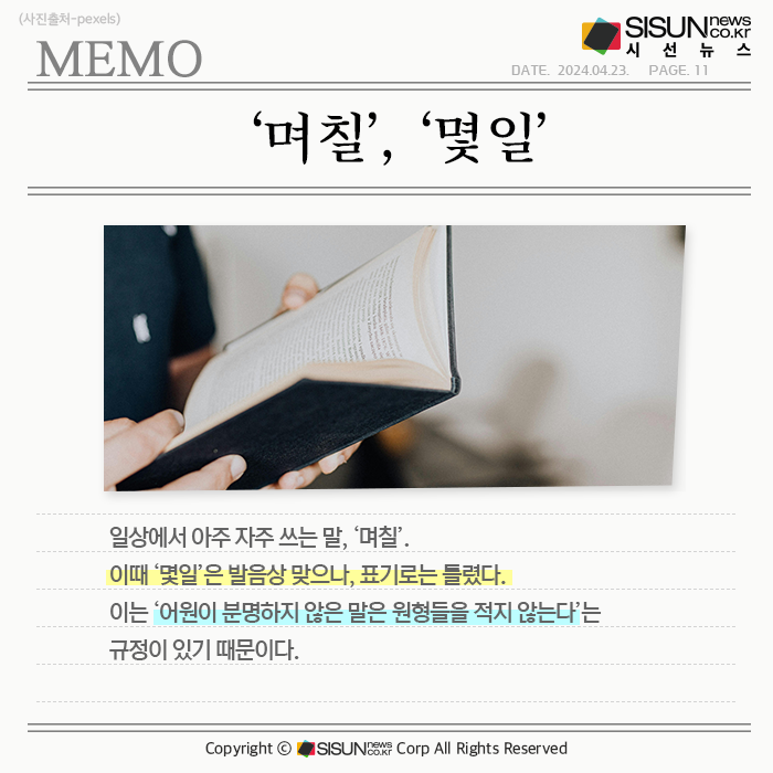 일상에서 아주 자주 쓰는 말, ’며칠‘. 이때 ’몇일‘은 발음상 맞으나, 표기로는 틀렸다. 이는 ’어원이 분명하지 않은 말은 원형들을 적지 않는다‘는 규정이 있기 때문이다. 무언가 이루어지길 ’바랄‘ 때도 ’바래‘라고 많이 쓰지만, ’바라‘가 맞다. ’바래다‘는 어떤 것의 색이 빛 등에 의해 변했을 때 쓰는 표현이다.