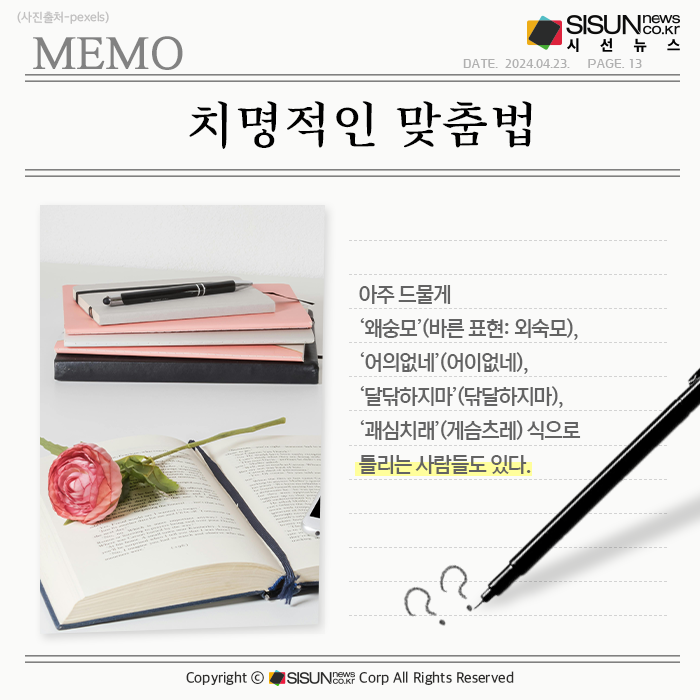 아주 드물게 ’왜숭모‘(바른 표현: 외숙모), ’어의없네‘(어이없네), ’달닦하지마‘(닦달하지마), ’괘심치래‘(게슴츠레) 식으로 틀리는 사람들도 있다. 사실 꾸준히 독서해 익힌 게 아니라면 언제든 맞춤법을 틀릴 수 있다. 다만 부끄러운 일을 만들지 않도록 ’헷갈릴‘ 땐 한 번 찾아보고 쓰는 게 좋겠다.