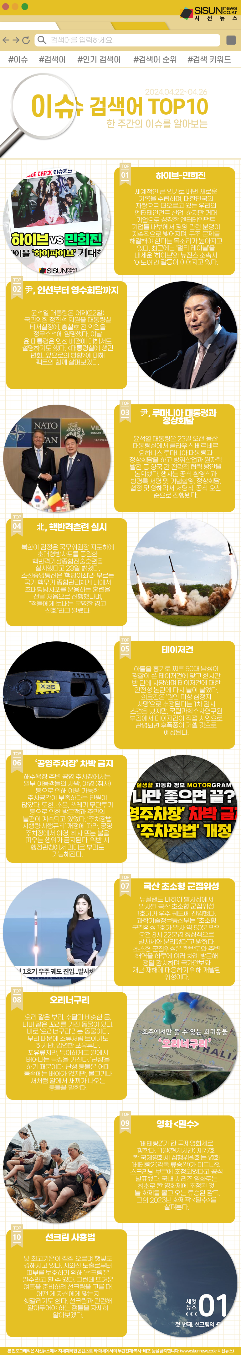 시선뉴스=박진아 기자 / 디자인=김선희 proㅣ지난주 한주간의 이슈 Top10입니다. 지난주에는 어떤 키워드들이 이슈가 되었을까요?