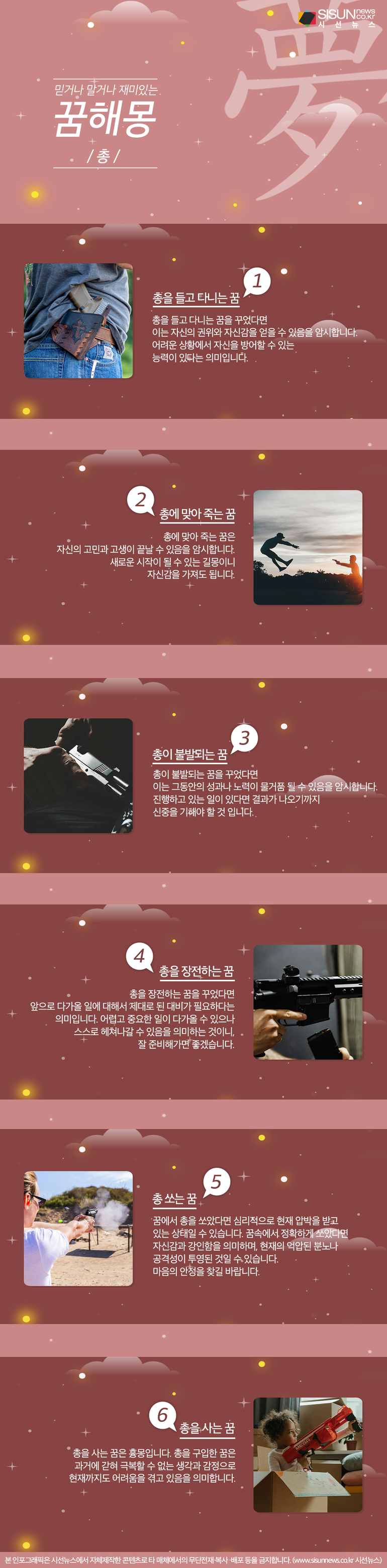 시선뉴스=박진아 기자 / 디자인=김선희 proㅣ예부터 꿈 해몽은 자신의 주변인의 미래를 예견하는데 중요한 역할을 해왔다. 물론 꿈 해몽이 정확하게 다 맞는 것은 아니지만 하루를 맞이하는 마음가짐에 적절한 참고를 해도 좋을 것이다. 오늘은 ‘총’에 관련된 꿈 해몽을 소개한다.