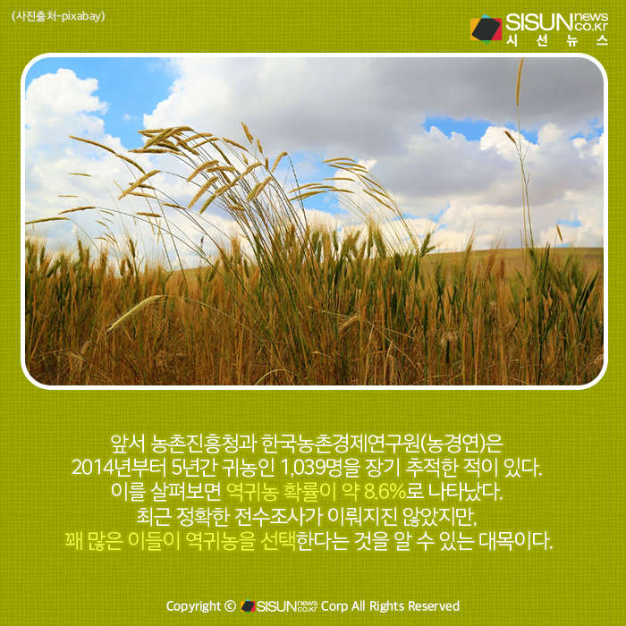 앞서 농촌진흥청과 한국농촌경제연구원(농경연)은 2014년부터 5년간 귀농인 1,039명을 장기 추적한 적이 있다. 이를 살펴보면 역귀농 확률이 약 8.6%로 나타났다. 최근 정확한 전수조사가 이뤄지진 않았지만, 꽤 많은 이들이 역귀농을 선택한다는 것을 알 수 있는 대목이다.