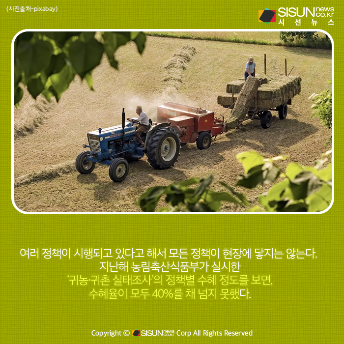 여러 정책이 시행되고 있다고 해서 모든 정책이 현장에 닿지는 않는다. 지난해 농림축산식품부가 실시한 ‘귀농·귀촌 실태조사’의 정책별 수혜 정도를 보면, 수혜율이 모두 40%를 채 넘지 못했다. 지자체에서 관련 정보를 제공받은 경우의 수혜 정도가 가장 높았는데, 이는 37%였다.