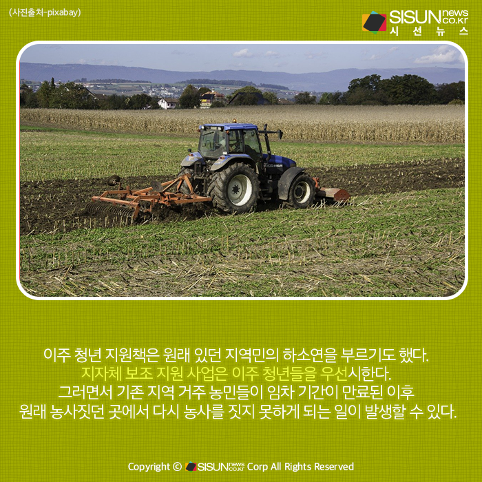 이주 청년 지원책은 원래 있던 지역민의 하소연을 부르기도 했다. 지자체 보조 지원 사업은 이주 청년들을 우선시한다. 그러면서 기존 지역 거주 농민들이 임차 기간이 만료된 이후 원래 농사짓던 곳에서 다시 농사를 짓지 못하게 되는 일이 발생할 수 있다.