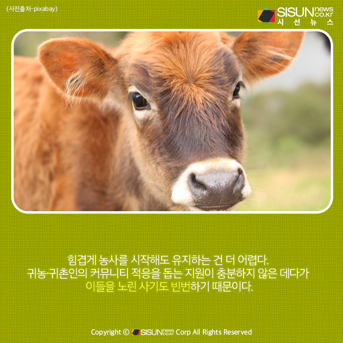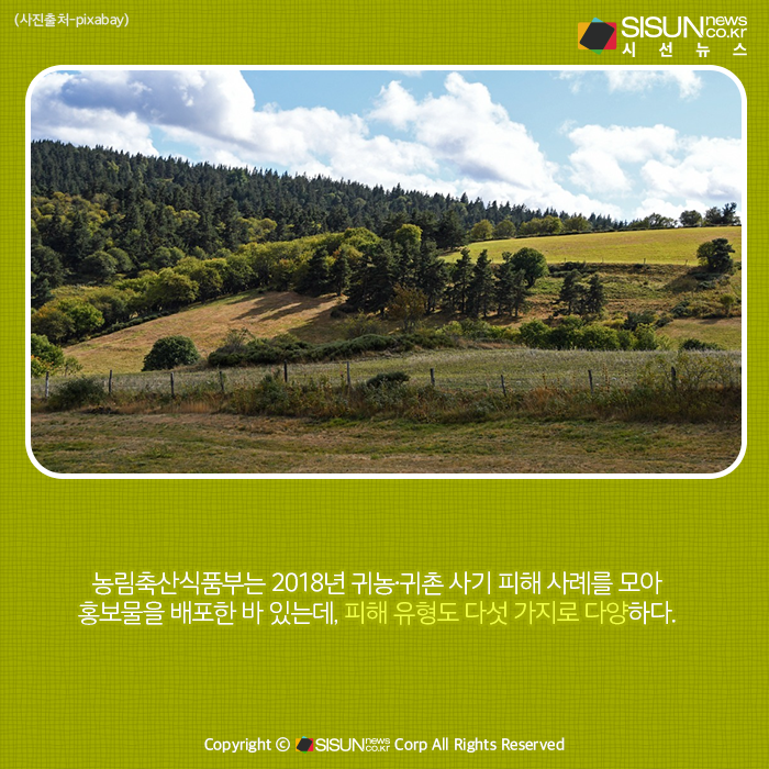 힘겹게 농사를 시작해도 유지하는 건 더 어렵다. 귀농·귀촌인의 커뮤니티 적응을 돕는 지원이 충분하지 않은 데다가 이들을 노린 사기도 빈번하기 때문이다. 농림축산식품부는 2018년 귀농·귀촌 사기 피해 사례를 모아 홍보물을 배포한 바 있는데, 피해 유형도 다섯 가지로 다양하다.