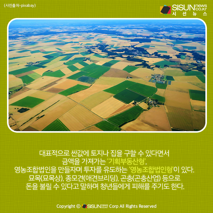 대표적으로 싼값에 토지나 집을 구할 수 있다면서 금액을 가져가는 ‘기획부동산형’, 영농조합법인을 만들자며 투자를 유도하는 ‘영농조합법인형’이 있다. 묘목(묘목상), 종모견(애견브리딩), 곤충(곤충산업) 등으로 돈을 불릴 수 있다고 말하며 청년들에게 피해를 주기도 한다.