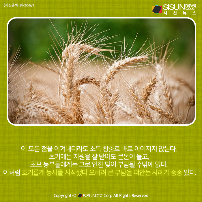 이 모든 점을 이겨내더라도 소득 창출로 바로 이어지지 않는다. 초기에는 지원을 잘 받아도 큰돈이 들고, 초보 농부들에게는 그로 인한 빚이 부담될 수밖에 없다. 이처럼 호기롭게 농사를 시작했다가 오히려 큰 부담을 떠안는 사례가 종종 있다.