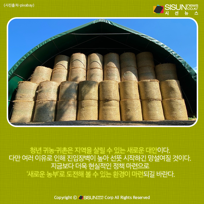 청년 귀농·귀촌은 지역을 살릴 수 있는 새로운 대안이다. 다만 여러 이유로 인해 진입장벽이 높아 선뜻 시작하긴 망설여질 것이다. 지금보다 더욱 현실적인 정책 마련으로 ‘새로운 농부’로 도전해 볼 수 있는 환경이 마련되길 바란다.
