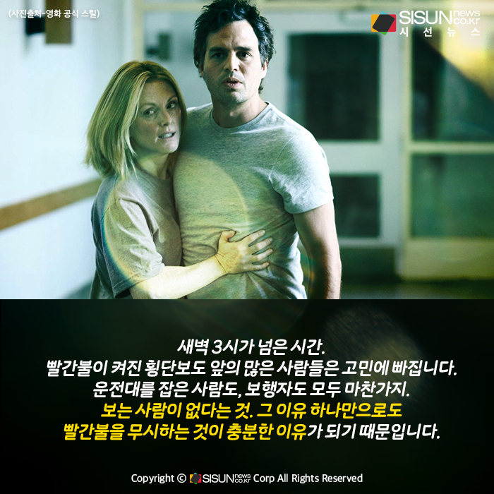 새벽 3시가 넘은 시간. 빨간불이 켜진 횡단보도 앞의 많은 사람들은 고민에 빠집니다. 운전대를 잡은 사람도, 보행자도 모두 마찬가지. 보는 사람이 없다는 것. 그 이유 하나만으로도 빨간불을 무시하는 것이 충분한 이유가 되기 때문입니다. 누군가 본다는 것, 그리고 보지 않는 다는 것. 그 사이 인간은 수없이 많은 생각을 하고 저급한 욕망을 보입니다. 그 끝은 어디일까, 영화 <눈먼 자들의 도시>입니다.