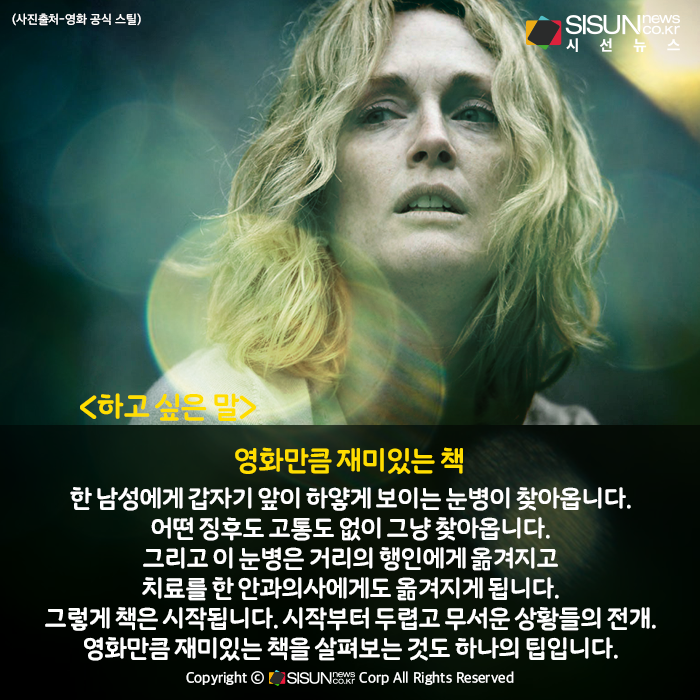 한 남성에게 갑자기 앞이 하얗게 보이는 눈병이 찾아옵니다. 어떤 징후도 고통도 없이 그냥 찾아옵니다. 그리고 이 눈병은 거리의 행인에게 옮겨지고 치료를 한 안과의사에게도 옮겨지게 됩니다. 그렇게 책은 시작됩니다. 시작부터 두렵고 무서운 상황들의 전개. 영화만큼 재미있는 책을 살펴보는 것도 하나의 팁입니다.
