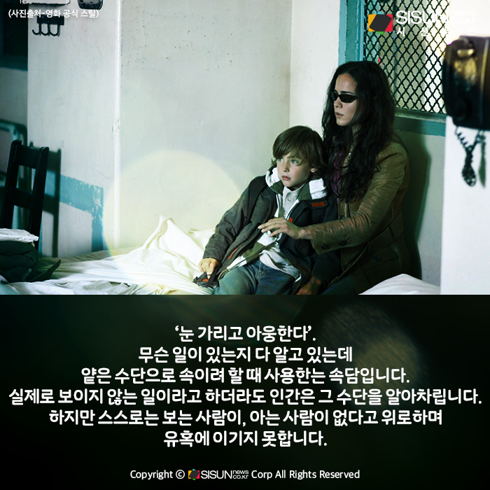 ‘눈 가리고 아웅한다’. 무슨 일이 있는지 다 알고 있는데 얕은 수단으로 속이려 할 때 사용한는 속담입니다. 실제로 보이지 않는 일이라고 하더라도 인간은 그 수단을 알아차립니다. 하지만 스스로는 보는 사람이, 아는 사람이 없다고 위로하며 유혹에 이기지 못합니다. 작은일 이니까 괜찮을 것이라고요? 그 일이 커진다면 어떻게 될까요. <눈먼 자들의 도시>에서 확인해 보십시오.