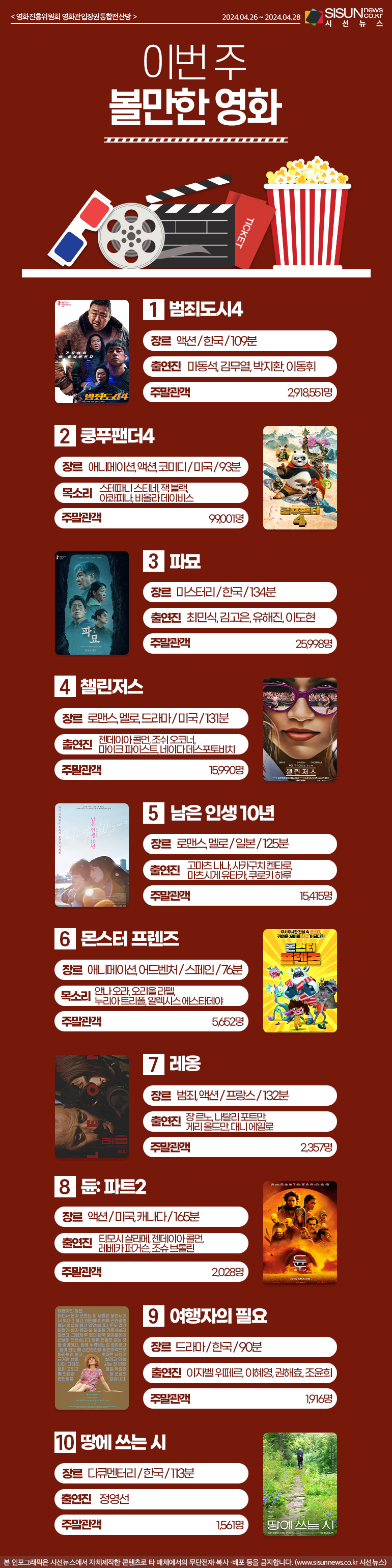 시선뉴스=김선희 proㅣ이번 주 볼만한 영화, 어떤 것들이 있을까요? 지난 2024년 04월 26일부터 2024년 04월 28까지 영화진흥위원회 영화관입장권통합전산망의 랭킹을 알려드립니다.