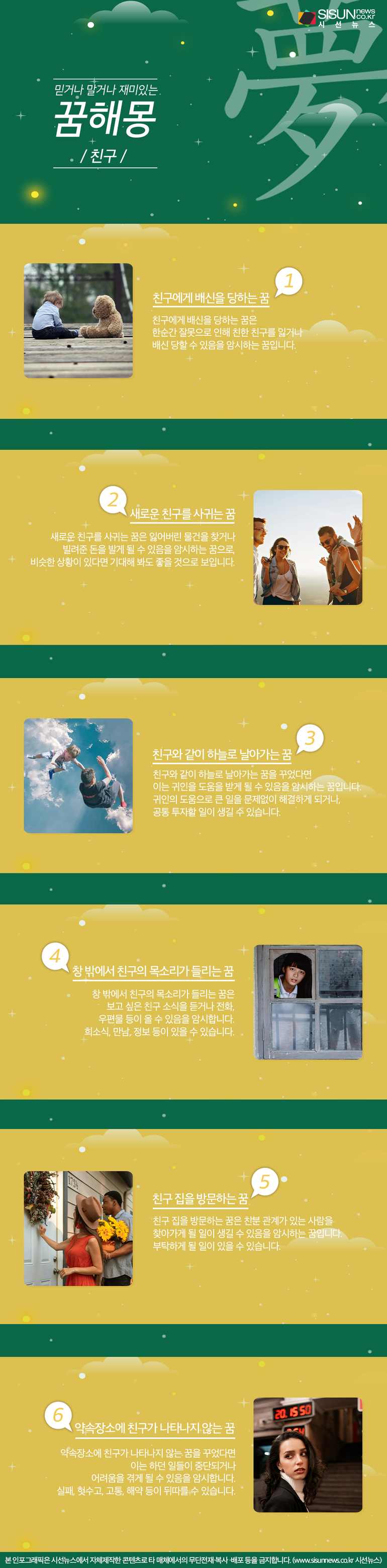시선뉴스=박진아 기자 / 디자인=김선희 proㅣ예부터 꿈 해몽은 자신의 주변인의 미래를 예견하는데 중요한 역할을 해왔다. 물론 꿈 해몽이 정확하게 다 맞는 것은 아니지만 하루를 맞이하는 마음가짐에 적절한 참고를 해도 좋을 것이다. 오늘은 ‘친구’에 관련된 꿈 해몽을 소개한다.