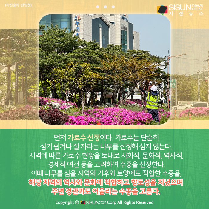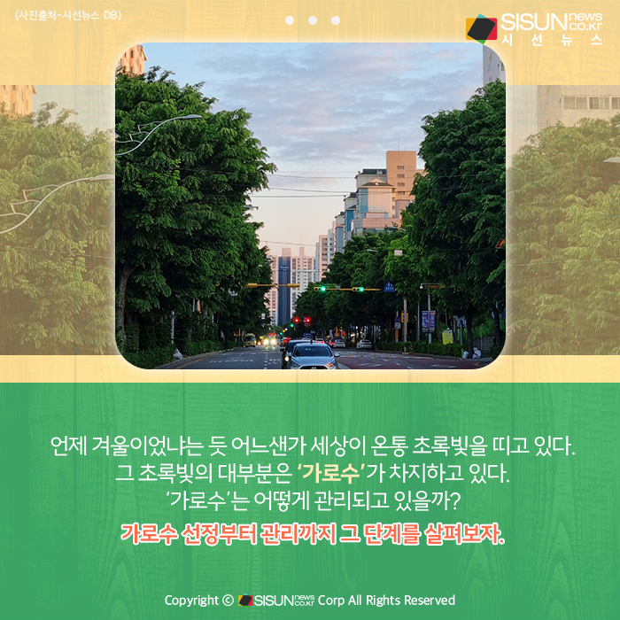 시선뉴스=양원민 기자 / 디자인=김선희 proㅣ언제 겨울이었냐는 듯 어느샌가 세상이 온통 초록빛을 띠고 있다. 그 초록빛의 대부분은 ‘가로수’가 차지하고 있는데, ‘가로수’는 어떻게 관리되고 있을까? 가로수 선정부터 관리까지 그 단계를 살펴보자.