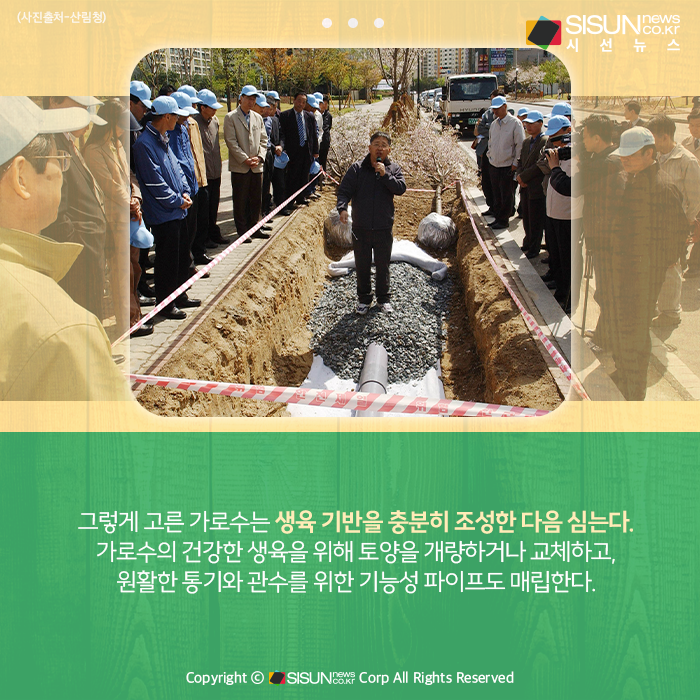 그렇게 고른 가로수는 생육 기반을 충분히 조성한 다음 심는다. 가로수의 건강한 생육을 위해 토양을 개량하거나 교체하고, 원활한 통기와 관수를 위한 기능성 파이프도 매립한다.