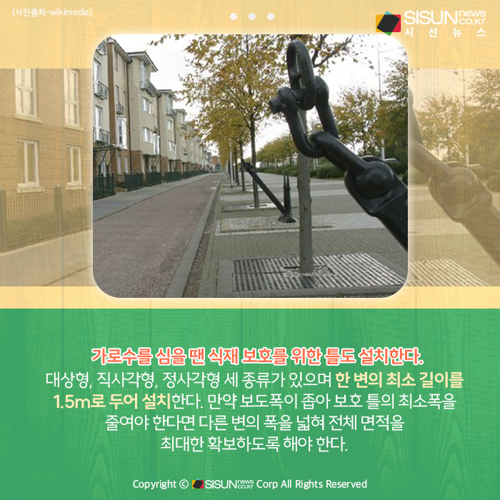 가로수를 심을 땐 식재 보호를 위한 틀도 설치한다. 대상형, 직사각형, 정사각형 세 종류가 있으며 한 변의 최소 길이를 1.5m로 두어 설치한다. 만약 보도폭이 좁아 보호 틀의 최소폭을 줄여야 한다면 다른 변의 폭을 넓혀 전체 면적을 최대한 확보하도록 해야 한다.