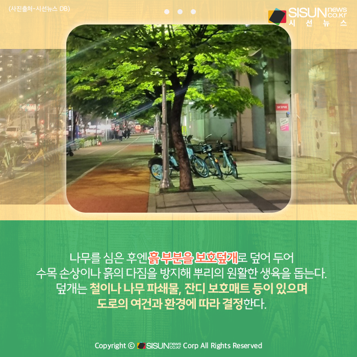 나무를 심은 후엔 흙 부분을 보호덮개로 덮어 두어 수목 손상이나 흙의 다짐을 방지해 뿌리의 원활한 생육을 돕는다. 덮개는 철이나 나무 파쇄물, 잔디 보호매트 등이 있으며 도로의 여건과 환경에 따라 결정한다.