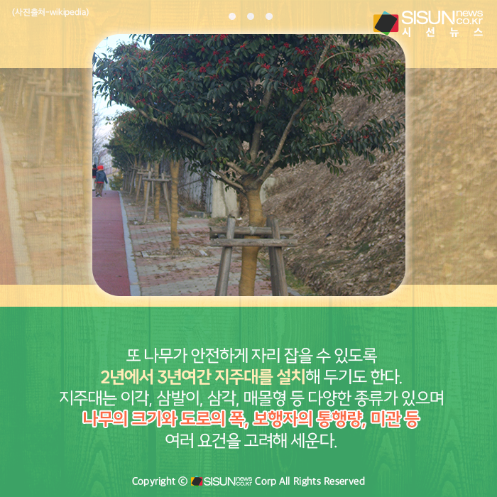 또 나무가 안전하게 자리 잡을 수 있도록 2년에서 3년여간 지주대를 설치해 두기도 한다. 지주대는 이각, 삼발이, 삼각, 매몰형 등 다양한 종류가 있으며 나무의 크기와 도로의 폭, 보행자의 통행량, 미관 등 여러 요건을 고려해 세운다.
