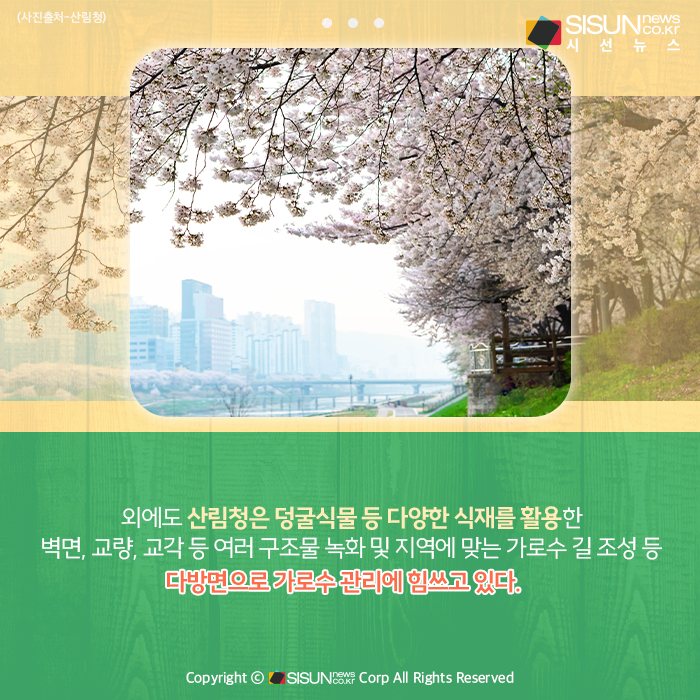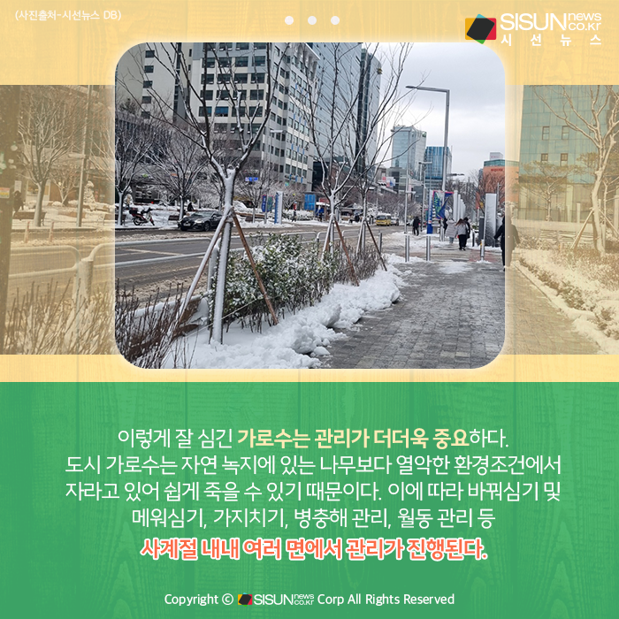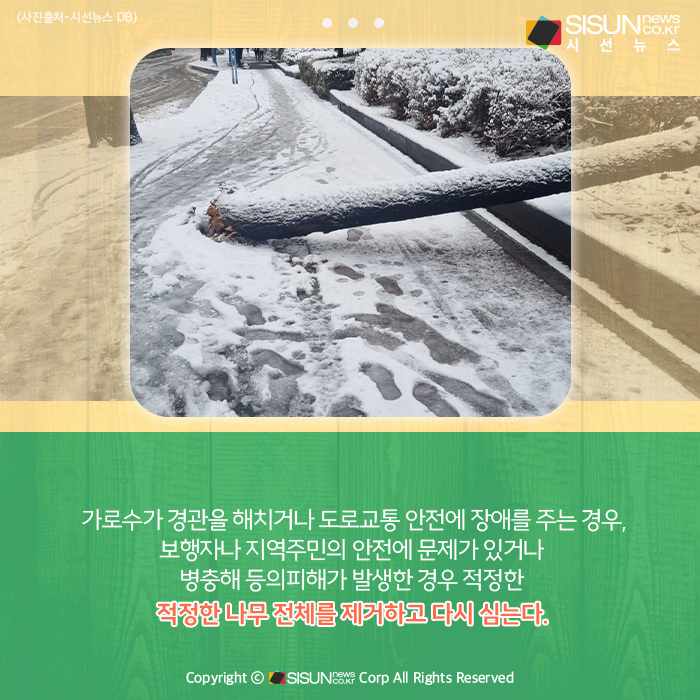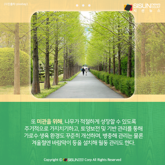 또 미관을 위해, 나무가 적절하게 성장할 수 있도록 주기적으로 가지치기하고, 토양보전 및 기반 관리를 통해 가로수 생육 환경도 꾸준히 개선하며, 병충해 관리는 물론 겨울철엔 바람막이 등을 설치해 월동 관리도 한다.