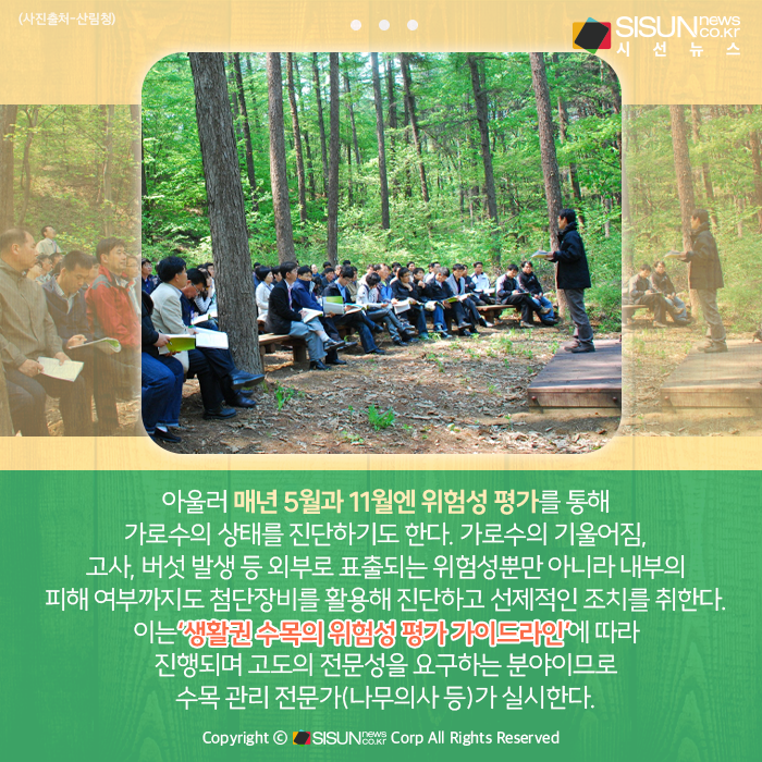 아울러 매년 5월과 11월엔 위험성 평가를 통해 가로수의 상태를 진단하기도 한다. 가로수의 기울어짐, 고사, 버섯 발생 등 외부로 표출되는 위험성뿐만 아니라 내부의 피해 여부까지도 첨단장비를 활용해 진단하고 선제적인 조치를 취한다. 이는 ‘생활권 수목의 위험성 평가 가이드라인’에 따라 진행되며 고도의 전문성을 요구하는 분야이므로 수목 관리 전문가(나무의사 등)가 실시한다.