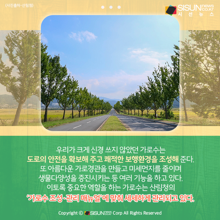 우리가 크게 신경 쓰지 않았던 가로수는 도로의 안전을 확보해 주고 쾌적한 보행환경을 조성해 준다. 또 아름다운 가로경관을 만들고 미세먼지를 줄이며 생물다양성을 증진시키는 등 여러 기능을 하고 있다. 이토록 중요한 역할을 하는 가로수는 산림청의 ‘가로수 조성·관리 매뉴얼’에 맞춰 세세하게 관리되고 있다.