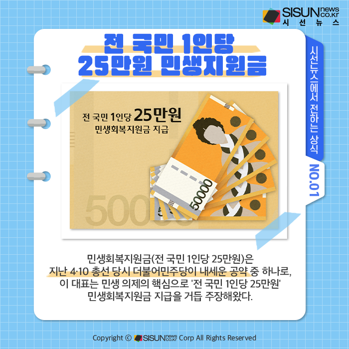 민생회복지원금(전 국민 1인당 25만원)은 지난 4·10 총선 당시 더불어민주당이 내세운 공약 중 하나로, 이 대표는 민생 의제의 핵심으로 '전 국민 1인당 25만원' 민생회복지원금 지급을 거듭 주장해왔다. 지역화폐로 지급되는 이 지원금에는 총 13조원 규모의 예산이 투입돼야 하는데, 이를 위해 민주당은 정부·여당에 추가경정예산(추경) 편성을 요구한 상태다.