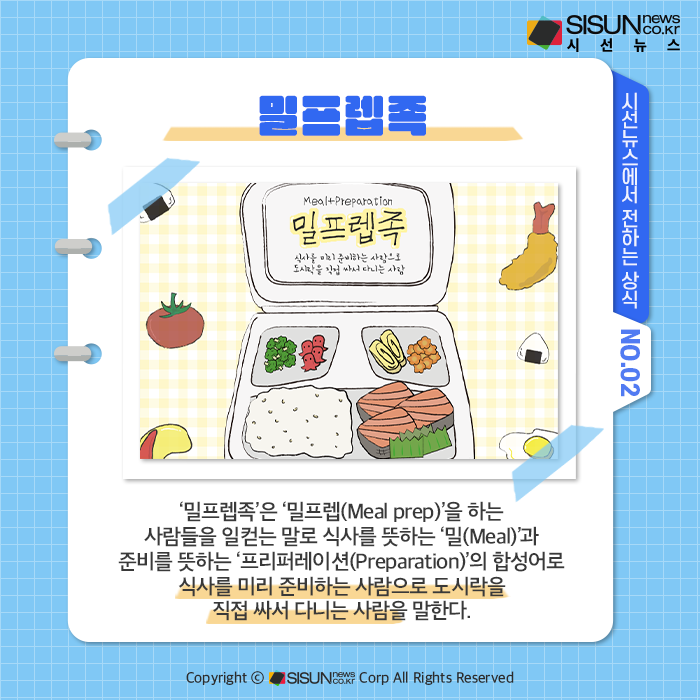 ‘밀프렙족’은 ‘밀프렙(Meal prep)’을 하는 사람들을 일컫는 말로 식사를 뜻하는 ‘밀(Meal)’과 준비를 뜻하는 ‘프리퍼레이션(Preparation)’의 합성어로 식사를 미리 준비하는 사람으로 도시락을 직접 싸서 다니는 사람을 말한다. 물가가 계속해서 상승하면서 편의점 도시락보다는 본인이 직접 준비해 비용도 아끼고 건강한 도시락을 만들어 먹겠다는 ‘밀프렙족’이 늘고 있다.