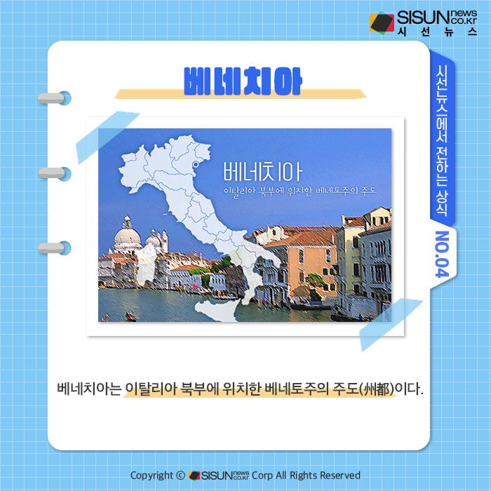 베네치아는 이탈리아 북부에 위치한 베네토주의 주도(州都)이다. 베네치아만 안쪽의 석호 위에 흩어져 있는 118개의 섬들이 약 400개의 다리로 이어져 있으며, 건물 사이 운하로 곤돌라가 떠다니는 낭만적인 도시이다.