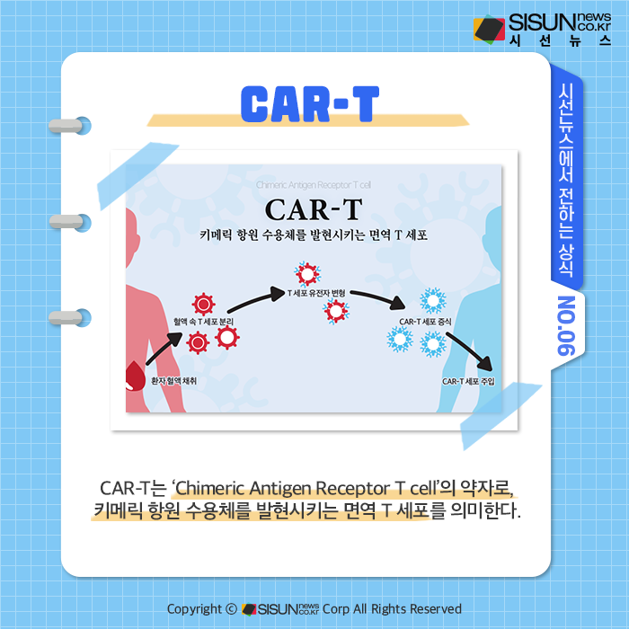 CAR-T는 ‘Chimeric Antigen Receptor T cell’의 약자로, 키메릭 항원 수용체를 발현시키는 면역 T 세포를 의미한다. CAR-T 치료제는 CAR-T세포가 암세포만 선택적으로 골라 공격하게 만든 것으로, 백혈병이나 B세포림프종 같은 암을 치료하는 데 사용된다.