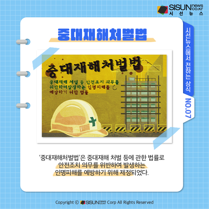 ‘중대재해처벌법’은 중대재해 처벌 등에 관한 법률로 안전조치 의무를 위반하여 발생하는 인명피해를 예방하기 위해 제정되었다. 대형 산업 현장에서 발생하는 노동자 사망사고와 화재사고, 살균제 사건과 같은 환경사고와 대형 운송사고 등이 빈발함에 따라 2021년 1월 26일 법률 제17907호로 제정되었고 지난달 27일부터 시행되었다.