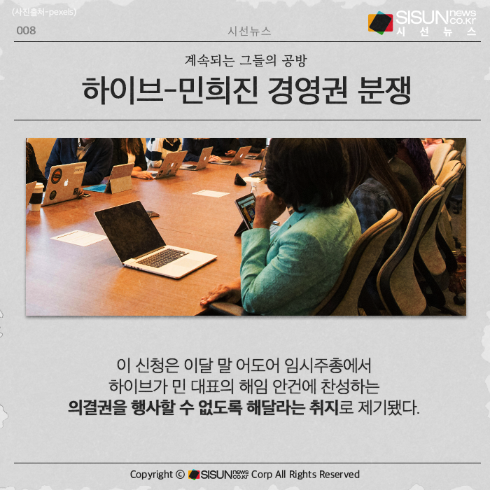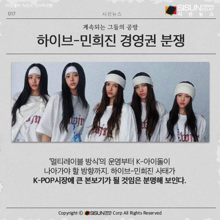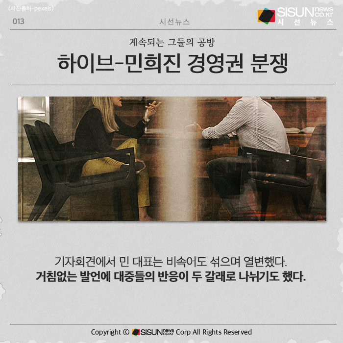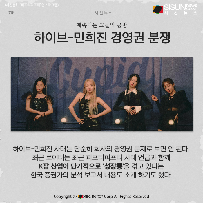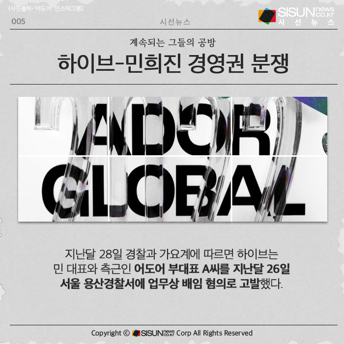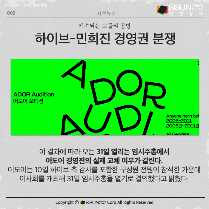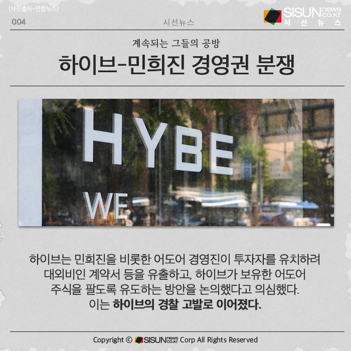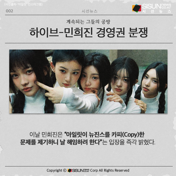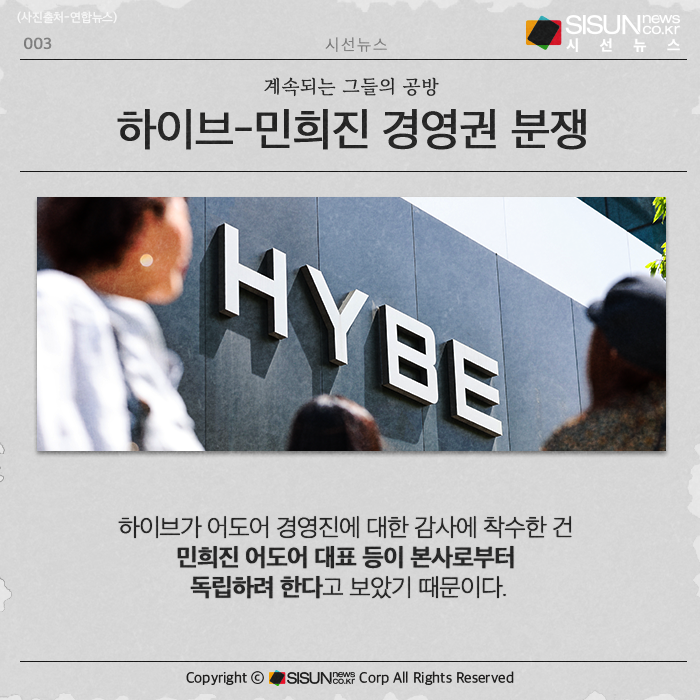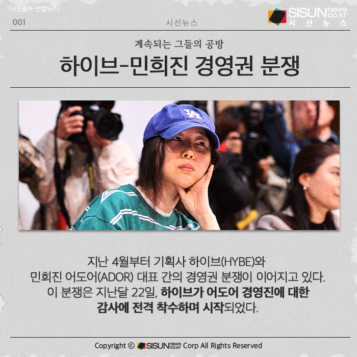 시선뉴스=정혜인 기자 / 디자인=김선희 proㅣ지난 4월부터 기획사 하이브(HYBE)와 민희진 어도어(ADOR) 대표 간의 경영권 분쟁이 이어지고 있다. 이 분쟁은 지난달 22일, 하이브가 어도어 경영진에 대한 감사에 전격 착수하며 시작되었다. 이날 민희진은 “아일릿이 뉴진스를 카피(Copy)한 문제를 제기하니 날 해임하려 한다”는 입장을 즉각 밝혔다.