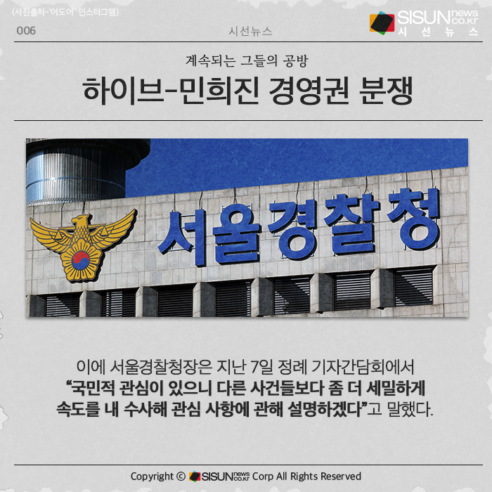 지난달 28일 경찰과 가요계에 따르면 하이브는 민 대표와 측근인 어도어 부대표 A씨를 지난달 26일 서울 용산경찰서에 업무상 배임 혐의로 고발했다. 이에 서울경찰청장은 지난 7일 정례 기자간담회에서 “국민적 관심이 있으니 다른 사건들보다 좀 더 세밀하게 속도를 내 수사해 관심 사항에 관해 설명하겠다”고 말했다.