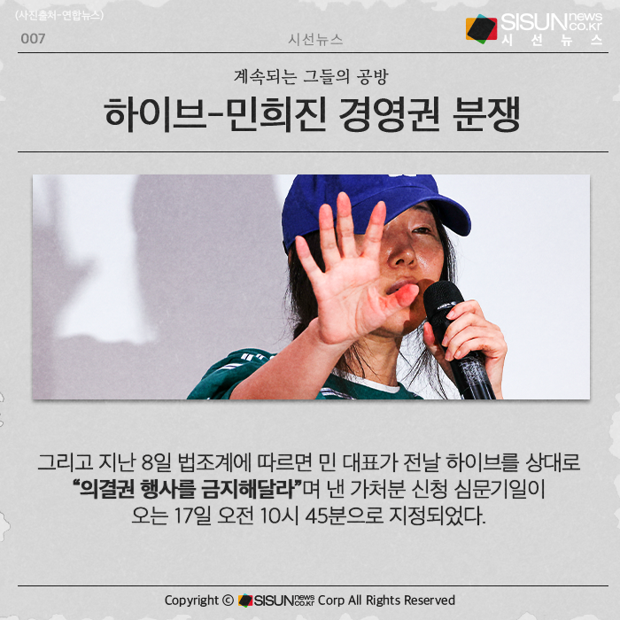 그리고 지난 8일 법조계에 따르면 민 대표가 전날 하이브를 상대로 “의결권 행사를 금지해달라”며 낸 가처분 신청 심문기일이 오는 17일 오전 10시 45분으로 지정되었다. 이 신청은 이달 말 어도어 임시주총에서 하이브가 민 대표의 해임 안건에 찬성하는 의결권을 행사할 수 없도록 해달라는 취지로 제기됐다.