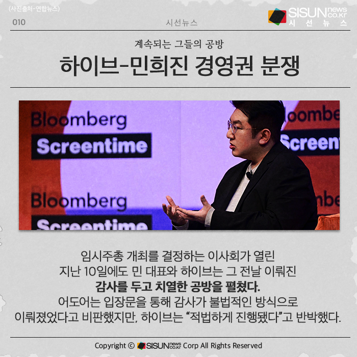 임시주총 개최를 결정하는 이사회가 열린 지난 10일에도 민 대표와 하이브는 그 전날 이뤄진 감사를 두고 치열한 공방을 펼쳤다. 어도어는 입장문을 통해 감사가 불법적인 방식으로 이뤄졌었다고 비판했지만, 하이브는 “적법하게 진행됐다”고 반박했다.