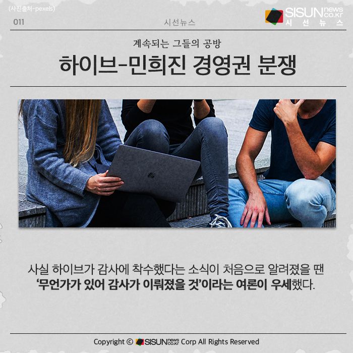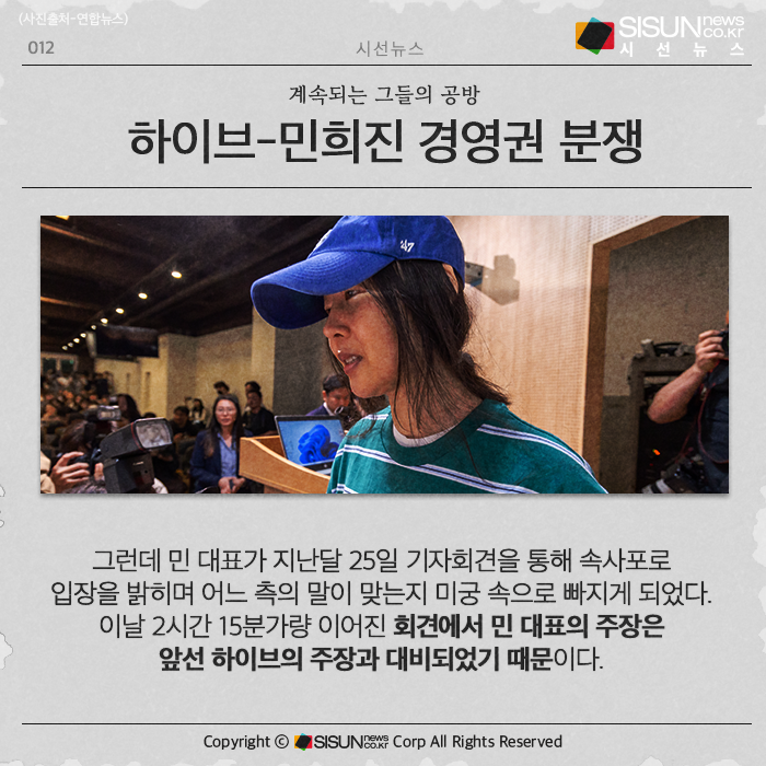 사실 하이브가 감사에 착수했다는 소식이 처음으로 알려졌을 땐 ‘무언가가 있어 감사가 이뤄졌을 것’이라는 여론이 우세했다. 그런데 민 대표가 지난달 25일 기자회견을 통해 속사포로 입장을 밝히며 어느 측의 말이 맞는지 미궁 속으로 빠지게 되었다. 이날 2시간 15분가량 이어진 회견에서 민 대표의 주장은 앞선 하이브의 주장과 대비되었기 때문이다.