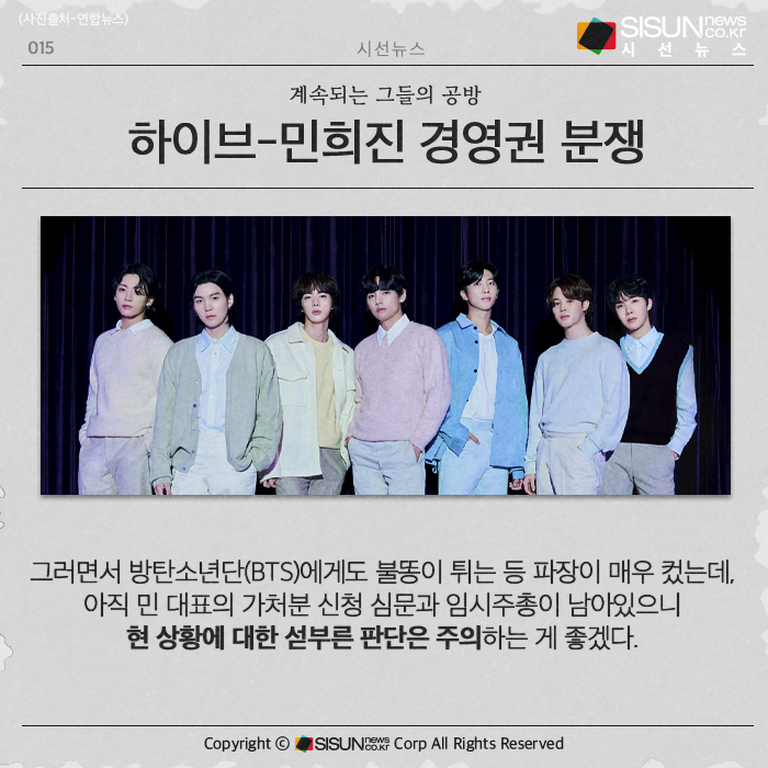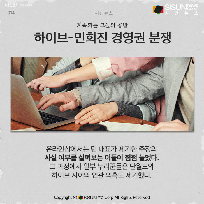 온라인상에서는 민 대표가 제기한 주장의 사실 여부를 살펴보는 이들이 점점 늘었다. 그 과정에서 일부 누리꾼들은 단월드와 하이브 사이의 연관 의혹도 제기했다. 그러면서 방탄소년단(BTS)에게도 불똥이 튀는 등 파장이 매우 컸다. 아직 민 대표의 가처분 신청 심문과 임시주총이 남아있으니 현 상황에 대한 섣부른 판단은 주의하는 게 좋겠다.