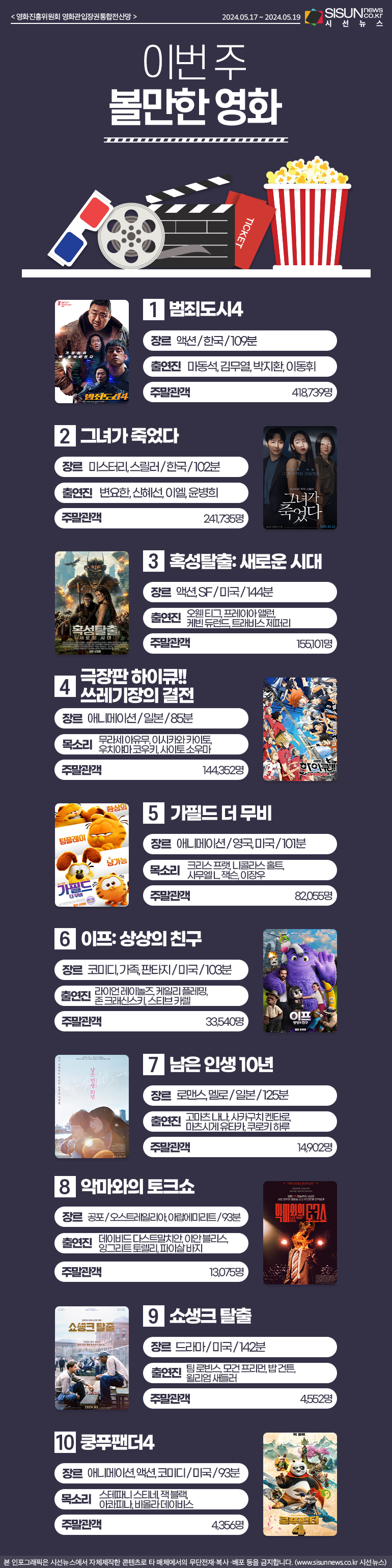 시선뉴스=김선희 proㅣ이번 주 볼만한 영화, 어떤 것들이 있을까요? 지난 2024년 05월 17일부터 2024년 05월 19까지 영화진흥위원회 영화관입장권통합전산망의 랭킹을 알려드립니다.