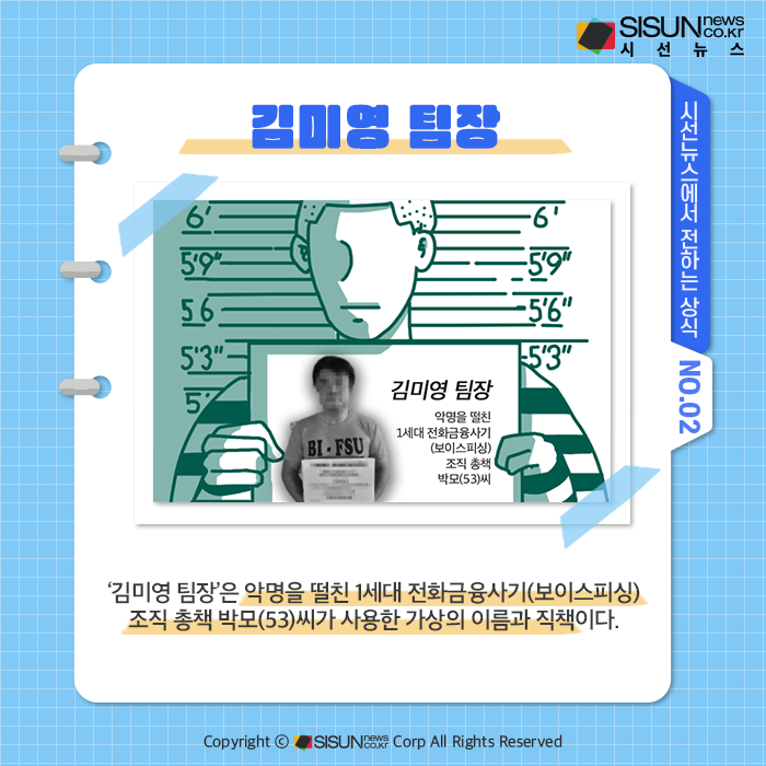 ‘김미영 팀장’은 악명을 떨친 1세대 전화금융사기(보이스피싱) 조직 총책 박모(53)씨가 사용한 가상의 이름과 직책이다. 한편 박 씨가 필리핀 현지 교도소에서 탈옥해 우리 정부가 비상 대응에 나섰다.