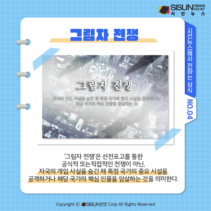 ‘그림자 전쟁’은 선전포고를 통한 공식적 또는 직접적인 전쟁이 아닌, 자국의 개입 사실을 숨긴 채 특정 국가의 중요 시설을 공격하거나 해당 국가의 핵심 인물을 암살하는 것을 의미한다. 주로 사이버 공격, 핵 과학자 암살, 무인기 공격 등이 이에 해당하며, 주변 세력이나 제3국을 통해 자행되기도 한다.