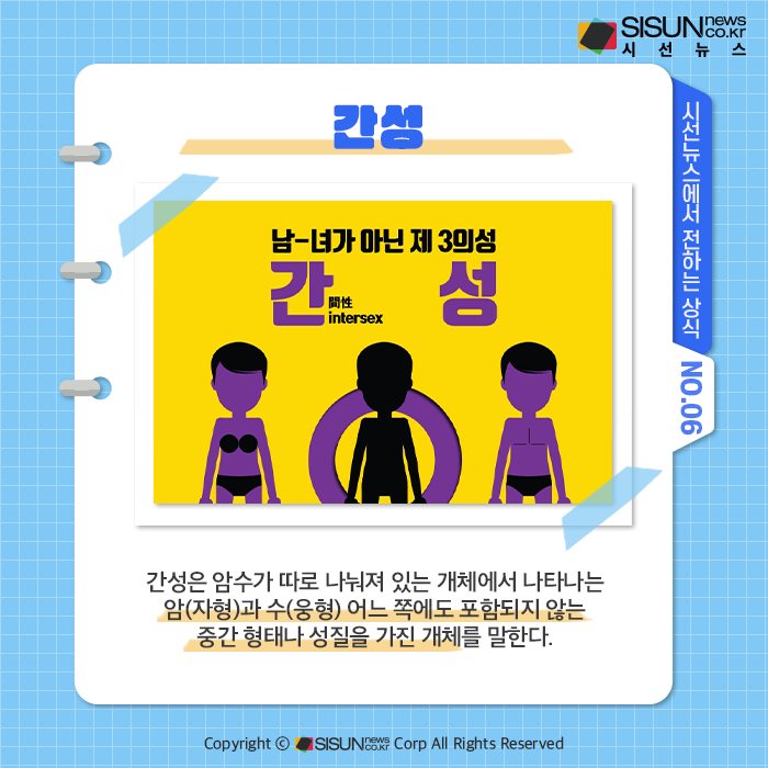 간성은 암수가 따로 나눠져 있는 개체에서 나타나는 암(자형)과 수(웅형) 어느 쪽에도 포함되지 않는 중간 형태나 성질을 가진 개체를 말한다. 많은 식물과 동물에서 이러한 간성이 나타나는데, 물론 인간도 마찬가지이다. 간성은 흔히 1차 성징, 2차 성징, 3차 성징 어느 과정에서 나타날 수 있고 심각한 정도도 각각 다 다르게 나타난다. 이때 간성 중 암컷형질을 강하게 나타내는 것을 ‘자간성’, 수컷형질을 강하게 나타내는 것을 ‘웅간성’이라 분류한다.