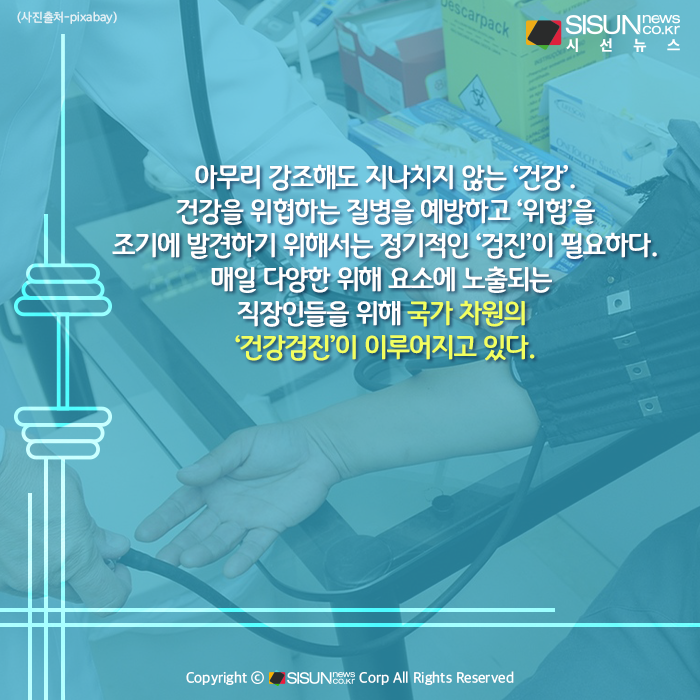 시선뉴스=심재민 기자 / 디자인=김선희 pro | 아무리 강조해도 지나치지 않는 ‘건강’. 건강을 위협하는 질병을 예방하고 ‘위험’을 조기에 발견하기 위해서는 정기적인 ‘검진’이 필요하다. 매일 다양한 위해 요소에 노출되는 직장인들을 위해 국가 차원의 ‘건강검진’이 이루어지고 있다.