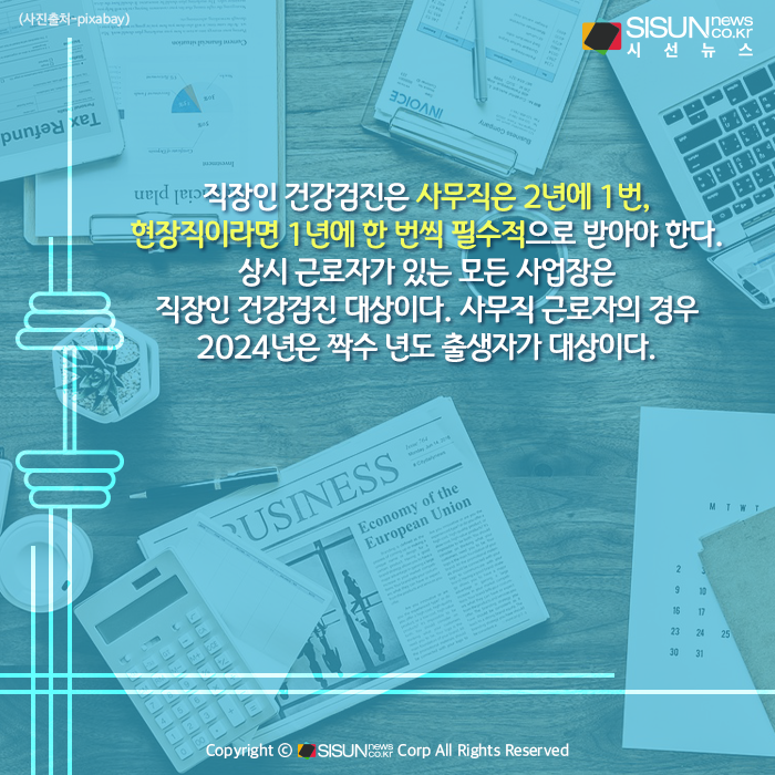 직장인 건강검진은 사무직은 2년에 1번, 현장직이라면 1년에 한 번씩 필수적으로 받아야 한다. 상시 근로자가 있는 모든 사업장은 직장인 건강검진 대상이다. 사무직 근로자의 경우 2024년은 짝수 년도 출생자가 대상이다.