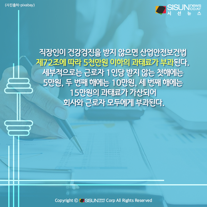 직장인이 건강검진을 받지 않으면 산업안전보건법 제72조에 따라 5천만원 이하의 과태료가 부과된다. 세부적으로는 근로자 1인당 받지 않는 첫해에는 5만원, 두 번째 해에는 10만원, 세 번째 해에는 15만원의 과태료가 가산되어 회사와 근로자 모두에게 부과된다.