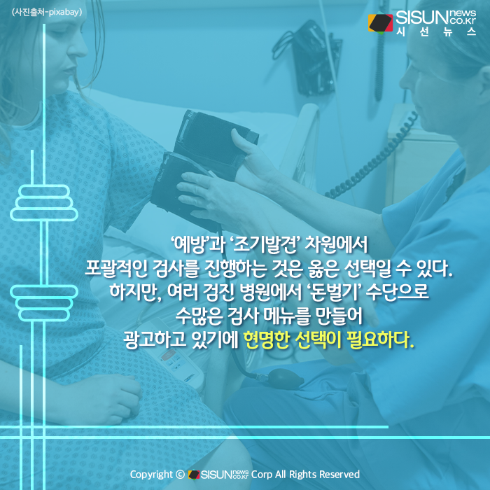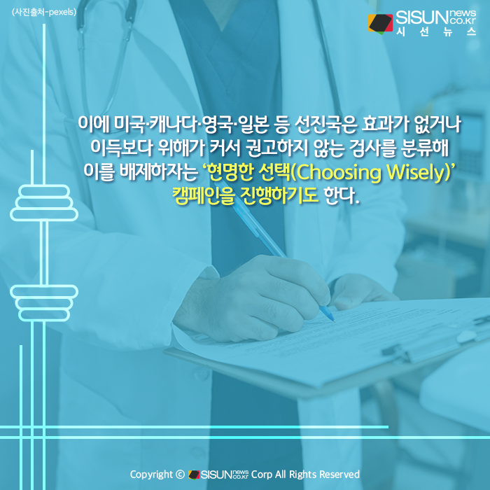 ‘예방’과 ‘조기발견’ 차원에서 포괄적인 검사를 진행하는 것은 옳은 선택일 수 있다. 하지만, 여러 검진 병원에서 ‘돈벌기’ 수단으로 수많은 검사 메뉴를 만들어 광고하고 있기에 현명한 선택이 필요하다. 이에 미국·캐나다·영국·일본 등 선진국은 효과가 없거나 이득보다 위해가 커서 권고하지 않는 검사를 분류해 이를 배제하자는 ‘현명한 선택(Choosing Wisely)’ 캠페인을 진행하기도 한다.